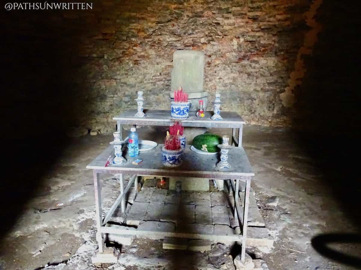 A metal altar has been placed in front of the temple’s ruined lingam shrine